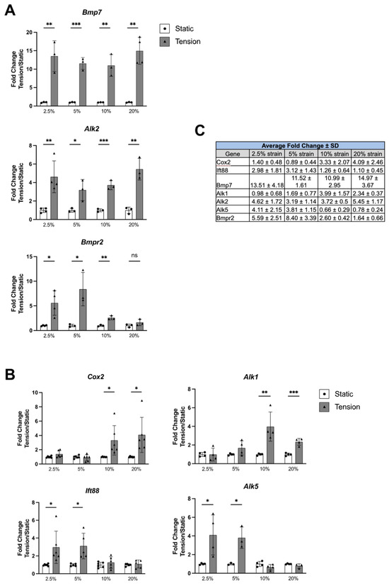 Transcriptional changes in BMP, cilia, and mechanosensation-associated genes in primary human PDL cells exposed to tensile strain. (A) The genes Bmp7, Alk2, and Bmpr2 were consistently upregulated across all magnitudes of tensile strain. (B) Cox2, a marker for cellular response to physical stimulation, and Alk1, a type I BMP signaling receptor, were exclusively upregulated at high strain levels of 10% and 20%. In contrast, Ift88, a primary cilia marker, and ALK5, another type I BMP signaling receptor, showed increased expression only under low strain intensities of 2.5% and 5%. Fold changes were measured between control cells (static, white columns) and cells exposed to varying tensile strains (tension, gray columns) as indicated on the x-axis in percent (%). Values are represented as fold changes ± SEM compared to static controls and mRNA expression was normalized to the housekeeping gene GAPDH. Statistical significance is denoted as follows: * p < 0.05, ** p < 0.01, *** p < 0.001. (C) Average fold changes of the genes presented as mean ± SD. Sample size: n = 3–4 per group.