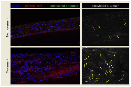 Images were acquired using a fluorescent microscope (Keyence BZ-X710, Keyence, Ōsaka, Japan). Laser lines at 405 nm and 561 nm were employed for sample excitation, with settings held constant across all analyzed images. To examine primary cilia and BMP signaling with tooth movement in vivo, histology sections of human teeth were deparaffinized, rehydrated, and rinsed for 10 min in tris-buffered saline (TBS). Following this, the sections were permeabilized with 0.1% Tween 20 (Sigma, Aldrich) for 5 min at room temperature, blocked with 10% goat serum (Sigma Aldrich) for 1 h at room temperature, and incubated in primary antibodies at 4 °C overnight. Antibodies against pSMAD1/5/8 (rabbit polyclonal, 1:250, Fisher Scientific, NH, USA) and acetylated α-tubulin (mouse monoclonal, 1:10, Sigma-Aldrich) were used to visualize BMP signaling and primary cilia, respectively. Sections were then incubated in the secondary antibodies anti-mouse Alexa Fluor 488 (1:500, Life Technologies, Carlsbad, CA, USA) and anti-rabbit Alexa Fluor 568 (1:500, Life Technologies) at room temperature for 1 h. Stained slides were then mounted with media containing the nuclear stain DAPI and sealed with nail polish (Electron Microscopy Sciences, Hatfield, PA, USA). Images were captured using a 316 Discover ECHO Confocal Microscope (ECHO, San Diego, CA, USA). The validity of the assays was ensured by routinely performing negative controls to exclude any artifacts, obtained by replacing the primary antibody with TBS/BSA. All antibodies were utilized at previously optimized concentrations. The quality of the original microphotographs of the stainings was routinely verified for high resolution and clarity, with particular attention to the coloring, to ensure no reduction in image quality.