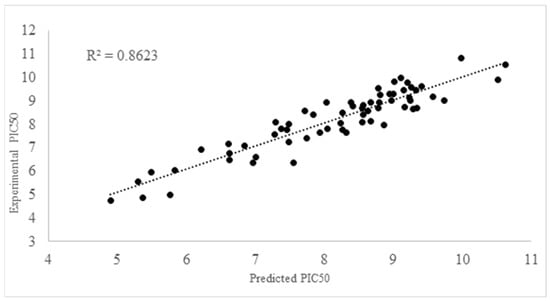 - pKI50 = 4.2275 + 2.1251A + 3.5830E − 05B − 10.1982C + 1.18754D − 1.0493E + 8.1419F + 0.6900G − 3.8395H; R2 = 0.8623, F = 33.088; s = 0.5846; N = 72; Q2loo = 0.7886; RMSE = 0.9377; MAE = 0.7941
