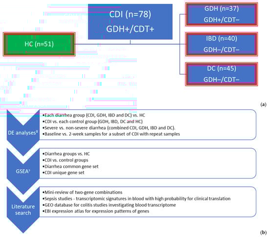 Graphical summary of methodology: (i) To identify diarrhea common immune responses in peripheral blood, each diarrhea group (blue boxes) was compared with HC (green box), and the overlapped genes in all four differential expression analyses were extracted. (ii) To identify CDI unique genes, CDI was compared with each of the control groups (red outline), and the overlapped genes in all four differential expression analyses were extracted. (iii) Functional annotation of differentially expressed genes and gene sets was performed with GSEA and literature searches. (a) Cases and controls and (b) Analysis plan. ¥ The primary filter for DE analysis was FDR adj. p < 0.05. When gene-sets were required to have a maximum number for GSEA (e.g., String database 3000 proteins max), |log2FC| < 0.5 was added. To reduce further the number of genes for literature searches, we used the top 20 genes with the highest |log2FC|, ↄ: GSEA was performed using R studio (Reactome pathways), IPA (summary and comparison), and String online database. DE: differential expression, CDI: toxigenic C. difficile infection, GDH: non-toxigenic C. difficile infection, IBD: inflammatory bowel disease, DC: diarrhea controls, HC: healthy controls, NICE: National Institute for Health and Care Excellence, GSEA: gene set enrichment analysis, EBI: European Bioinformatics Institute, FDR adj. p: false discovery rate adjusted p-value, |log2FC|: an absolute value of logarithm with base 2 of fold change, IPA: Ingenuity Pathway Analysis by QIAGEN.