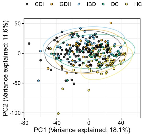 Principal component analysis (PCA) normalized gene expression data for each sample, colored by participant groups. CDI: toxigenic C. difficile infection, GDH: non-toxigenic C. difficile infection, IBD: inflammatory bowel disease, DC: diarrhea controls, HC: healthy controls, PC1: primary component 1, PC2: primary component 2.