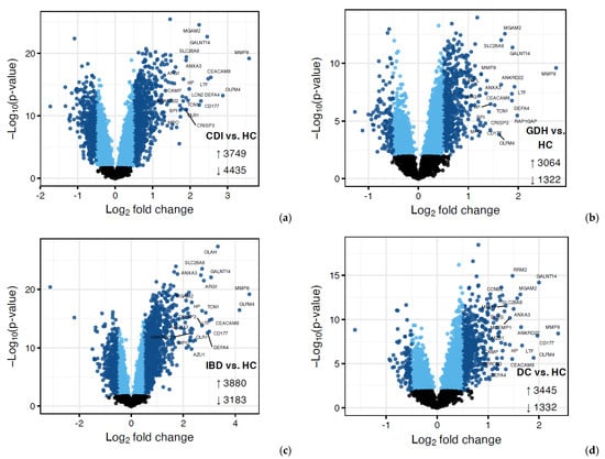 Volcano plots (a–d) of differential expression (DE) analysis of diarrhea groups vs. HC where genes with FDR adjusted p < 0.05 are displayed in blue, with darker blue points indicating those with |log2FC| > 0.5. CDI: toxigenic C. difficile infection, GDH: non-toxigenic C. difficile infection, IBD: inflammatory bowel disease, DC: diarrhea controls, HC: healthy controls, FDR adj. p: false discovery rate adjusted p-value, |log2FC|: logarithm with base 2 of fold change.