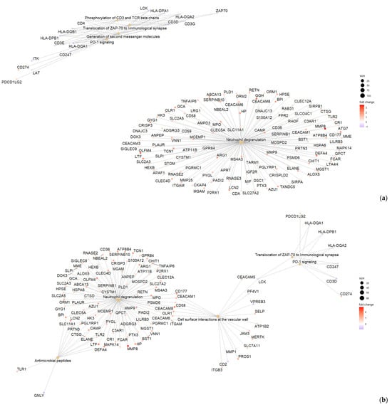 Despite the heterogeneity between groups, we identified a common inflammatory response at the transcription level in blood. Innate immunity and particularly neutrophil-related functions were significantly upregulated in all diarrhea groups compared with our HC, which was consistent with previous reports []. This non-specific response in the blood was shared in most inflammatory conditions, including sepsis. Presumably, there were more than 12 (that our search was confined to) co-shared genes from the big pool of common genes (2255). Circulating neutrophil subpopulations, although they have lower total RNA content per cell compared with other circulating cells, alter their transcriptome to minor environmental changes such as brief exercise, and this enhancement is proportional to the extent of inflammation/disease and migration activity [,,,]. Nevertheless, the literature is scarce regarding the overlap in neutrophil activation signatures amongst the different inflammatory conditions [,].