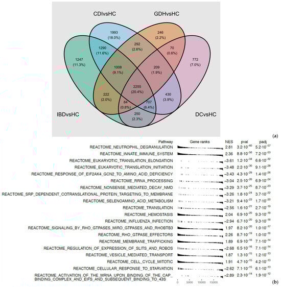 (a) Venn diagram of diarrhea groups vs. HC (FDR adj. p-value < 0.05) and (b) Reactome pathways from GSEA of pooled t statistics comparing all diarrhea groups vs. HC. CDI: toxigenic C. difficile infection, GDH: non-toxigenic C. difficile infection, IBD: inflammatory bowel disease, DC: diarrhea controls, HC: healthy controls, FDR adj. p: false discovery rate adjusted p-value.