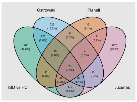 Venn diagram representing the overlap of differentially expressed genes between IBD and HC (FDR adj. p-value < 0.05 and |log2FC| > 0.5) among our cohort (IBD vs. HC) and published studies [,,]. IBD: inflammatory bowel disease, HC: healthy controls.
