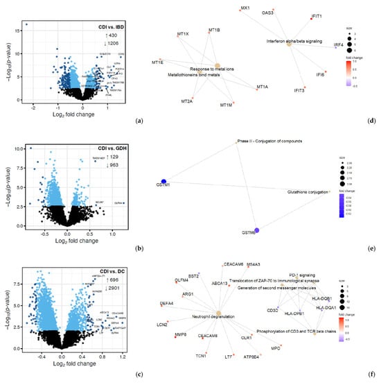 Differential expression (DE) analysis of CDI vs. diarrhea groups. (a–c) Volcano plots where genes with FDR adjusted p < 0.05 are displayed in blue, with darker blue points indicating those considered differentially expressed for IPA. (d–f) Enrichment summaries of genes with |log2FC| > 0.5. CDI: toxigenic C. difficile infection, GDH: non-toxigenic C. difficile infection, IBD: inflammatory bowel disease, DC: diarrhea controls, FDR adj. p: false discovery rate adjusted p-value, |log2FC|: logarithm with base 2 of fold change, IPA: Ingenuity Pathway Analysis.