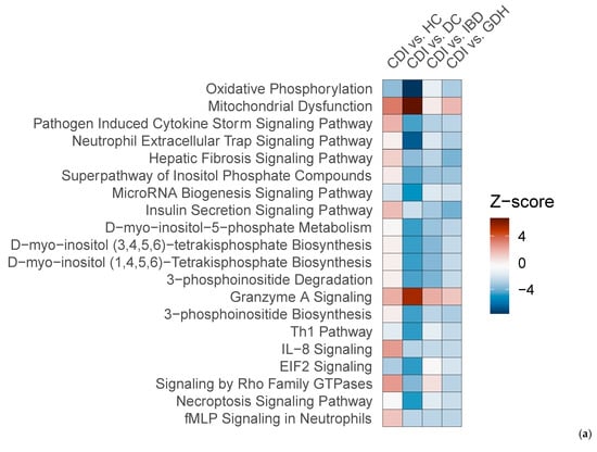 We compared CDI with the three diarrhea groups (GDH, IBD, and DC), and we found that gene expression in peripheral blood differed, with most genes being downregulated in CDI (Figure 7a–c). Although neutrophil degranulation was observed between CDI vs. DC, it did not appear when CDI was compared with IBD or GDH (Figure 7d–f). A comparison of CDI vs. all four controls with Ingenuity Pathway Analysis (IPA) revealed that the IL-8 pathway was the only significant canonical pathway (|z-score| > 2) in all comparisons, which was least upregulated in CDI compared with the control groups (Figure 8a).