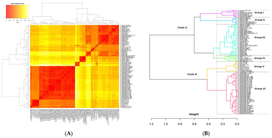 Pangenome clustering of the Chlamydiaceae family. (A) Heatmap clustering according to 2009 pangenome genes from 101 genomes of the Chlamydiaceae family. Gower distance score based on presence—absence pangenome matrix: Red = more similar, white = less similar. (B) Hierarchical clustering dendrogram based on the Gower dissimilarity matrix applying Average Silhouette Width statistics for groups generation based on genetic diversity. The groups are delineated by the dashed lines.