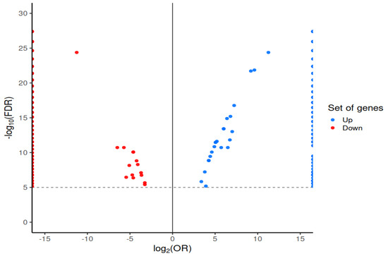 The presence of unique gene clusters associated with Chlamydia and Chlamydophila was investigated through a Pan-GWAS analysis conducted using the phylogeny-based Scoary method. The analysis revealed 289 genes differentially abundant between both, surpassing the adjusted p-value threshold of 1 × 10⁻5 as shown in Figure 3. The COG annotation showed that a total of 19% of the genes were classified as having an unknown function, 9% as related to translation, ribosomal structure, and biogenesis, and 7.5% as involved in cell wall/membrane/envelope biogenesis, 7.5% as inorganic ion transport and metabolism, 5.88% as replication, recombination, and repair, and 5.34% as intracellular trafficking, secretion, and vesicular transport.