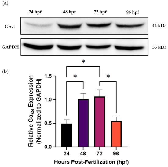 Western blot analysis of the temporal expression pattern of the short Gαs isoform (GαsS) in whole wild-type zebrafish from 24 to 96 h post-fertilization (hpf). (a) Representative blot of the GαsS expression level using GAPDH as a loading control. Whole zebrafish tissue lysates were used to extract total protein (~40 µg loaded per well). (b) The band intensities were quantified using ImageJ software, followed by normalization of the GαsS band intensity to that of GAPDH, yielding the relative GαsS expression level in arbitrary units. One-way ANOVA followed by Tukey’s multiple comparisons test were performed (* p < 0.05). Each bar represents the mean ± SEM (n = 3).
