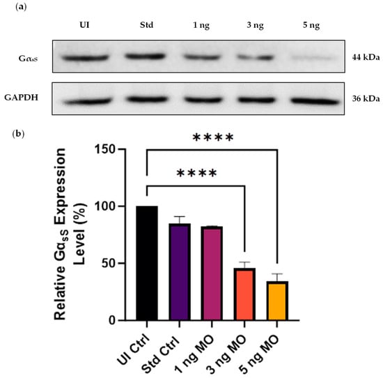 Western blot analysis of the knockdown efficiency of the three gnas Morpholino (MO) doses at 48 hpf. (a) Representative blot of the GαsS expression level in non-injected control (UI Ctrl) and standard control (Std Ctrl) embryos compared to those injected with 1, 3, and 5 ng of gnas MOs. The Std Ctrl embryos were injected with 5 ng of Std Ctrl MO. Whole zebrafish tissue lysates were used to extract total protein (~40 µg loaded per well) and GAPDH served as a loading control. (b) The band intensities were quantified using ImageJ software, followed by normalization of the GαsS band intensity to that of GAPDH. The GαsS expression level was expressed as a percentage of that in the UI Ctrl embryos. One-way ANOVA followed by Tukey’s multiple comparisons test were performed (**** p < 0.0001). Each bar represents the mean ± SEM (n = 4).