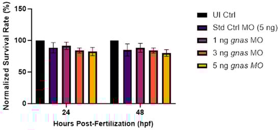 The survival rates at 24 and 48 hpf of the zebrafish embryos (n ≈ 20 per group) injected with 5 ng of Std Ctrl MO or different doses (1, 3, or 5 ng) of gnas MOs. The survival rates were normalized to those of the non-injected controls (UI Ctrl). Two-way ANOVA and Tukey’s post hoc test were performed, indicating no significant differences between the survival rates at either timepoints. Each bar represents the mean ± SEM (n = 4).