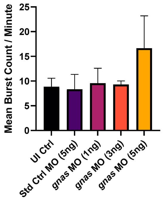 Secondly, the rate of spontaneous tail flicks of zebrafish embryos at 24 hpf was measured as an indicator of neurotoxicity using the DanioScope software []. Tail flicking is the first movement elicited by the developing nervous system of zebrafish embryos []. Our analysis revealed no significant differences in the tail-flicking rates, represented by the mean burst count per minute, among the different injected and non-injected groups (Figure 4). However, the frequency of tail flicks was higher, yet more variable, in the group injected with 5 ng of gnas MOs compared to the other groups (Figure 4).