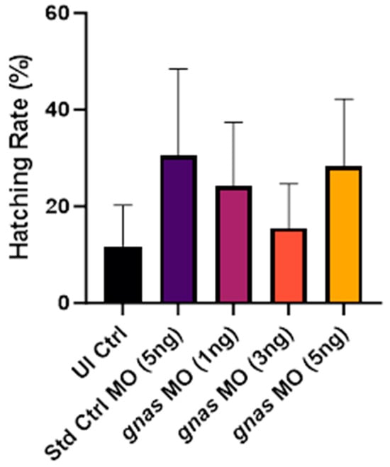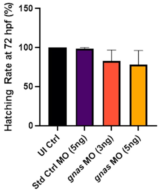 The specificity of the gnas knockdown facilitated a focused examination of different phenotypes in the early zebrafish embryos. With respect to the hatching rate at 48 hpf (Figure 5), the large variability could be attributed to differences in the quality of embryos from distinct clutches and breeding tanks []. It is also noted that the hatching times can vary significantly even within a single clutch and that earlier hatching does not invariably suggest faster development [].