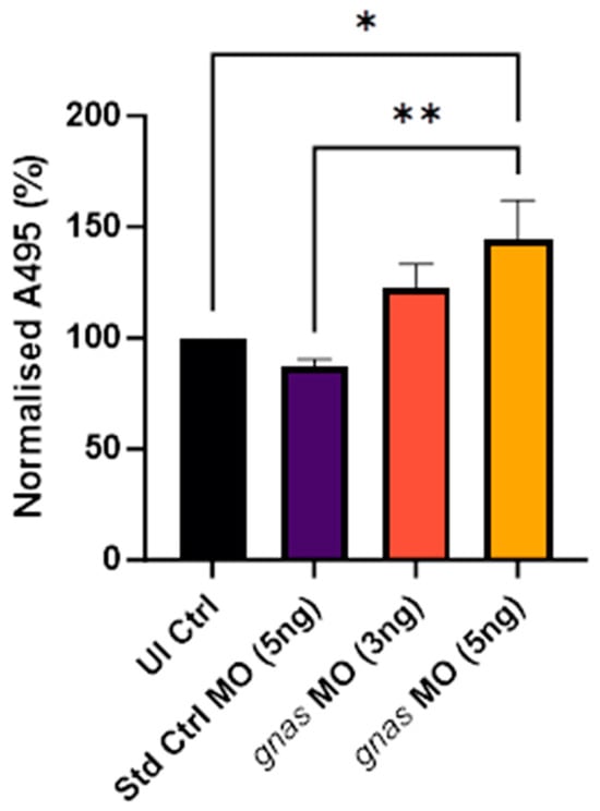 A dose-dependent increase in the absorbance (A495) was observed in the gnas morphants compared to the controls, indicating an increase in neutral lipid content (Figure 6). This change was statistically significant at the higher (5 ng) gnas MO dose relative to the UI Ctrl and Std Ctrl groups (p < 0.05 and p < 0.01, respectively). This is likely a specific effect of gnas knockdown, as Std Ctrl morphants did not exhibit an increase in staining, but rather a slight, insignificant decrease compared to non-injected controls.