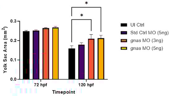 Knockdown of the gnas gene resulted in a significant increase in yolk sac area in zebrafish larvae at 120 hpf, compared to non-injected controls (p < 0.05), as depicted in Figure 7. At 72 hpf, slight but insignificant increases in yolk sac areas were noted in gnas morphants compared to non-injected controls. No significant difference was observed between the mean yolk size of Std Ctrl morphants and that of non-injected controls, suggesting that this effect was specific to gnas knockdown.