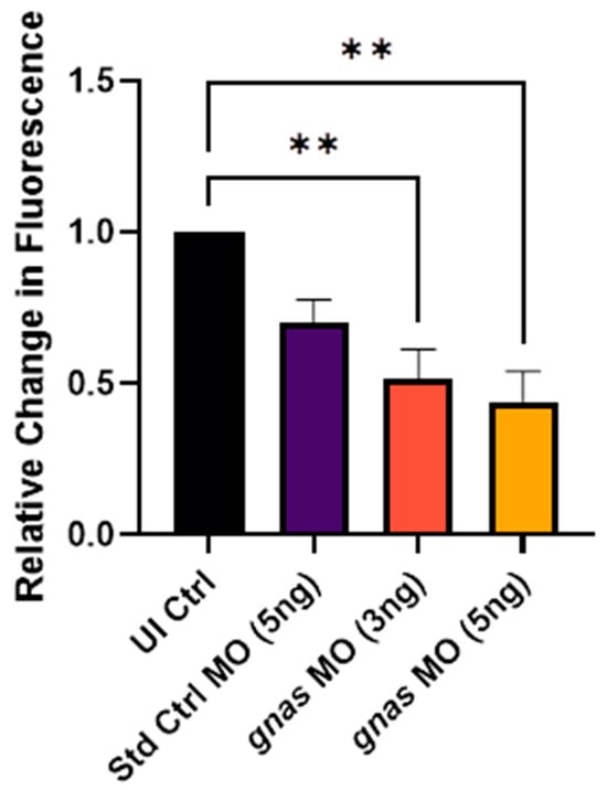 The alamarBlueTM assay, which measures in vivo NADH2 production via the Krebs cycle as a direct indicator of metabolic rate, was performed at 72–96 hpf based on previous studies [,]. In this assay, the non-fluorescent compound resazurin permeates the zebrafish tissues, where it is reduced by NADH2 in the metabolically active cells to produce the fluorescent compound resorufin []. Compared to non-injected controls, gnas morphants exhibited significantly lower metabolic rates, as indicated by the relative change in fluorescence from 72 to 96 hpf (p < 0.01). This decrease was greatest for the morphants injected with 5 ng of gnas MOs, with a relative change in fluorescence of 0.44 (p < 0.01), and smallest for the morphants injected with 5 ng of Std Ctrl MO, which displayed a relative change in fluorescence of 0.70 (ns; Figure 8). Thus, this effect was MO-dose-dependent, statistically significant, and specific to gnas knockdown.