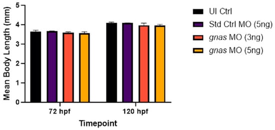 The mean body lengths of zebrafish larvae (n = 10 per group), at 72 and 120 hpf, injected with 5 ng of Std Ctrl MO or two doses (3 or 5 ng) of gnas MOs, compared to those of non-injected controls (UI Ctrl). Two-way ANOVA and Tukey’s multiple comparisons test were performed, indicating no significant differences. Each bar represents the mean ± SEM (n = 3).
