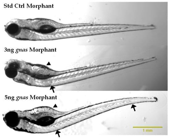 Representative images of the lateral views of standard control and gnas (3 and 5 ng) morphants at 120 hpf. Spine curvature and yolk sac enlargement of the gnas morphants are indicated by arrows and arrowheads, respectively. The images were captured at 20× magnification following straightening of the larvae in methylcellulose as much as possible.
