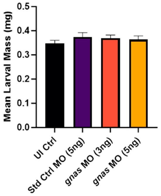 The mean larval masses of zebrafish larvae (n ≈ 20 per group), at 120 hpf, injected with 5 ng of Std Ctrl MO or two doses (3 or 5 ng) of gnas MOs, compared to those of non-injected controls (UI Ctrl). One-way ANOVA and Tukey’s multiple comparisons test were performed, indicating no significant differences. Each bar represents the mean ± SEM (n = 3).