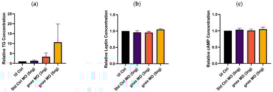 ELISA was employed to assess the triglyceride (TG), cAMP, and leptin levels in gnas morphant larvae compared to controls. This was performed at 72 hpf as it was an appropriate timepoint as described in the literature []. The results indicated a dose-dependent increase in TG levels specific to the gnas morphants, while the cAMP and leptin levels remained largely unaffected. Despite these observations, the increase in TG level did not show statistical significance due to the large variability in the data, particularly for the morphants injected with 5 ng of MOs, as indicated by the large error bar (Figure 13). This variability may be due to various reasons, including variability in kit age and gene knockdown efficiency across different embryos within the same experimental group.