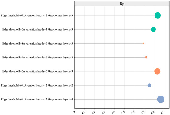 Therefore, it can be inferred that while increasing the number of attention heads enhances the performance of the Graphormer, it may also introduce redundancy into the model. After establishing the optimal settings for edge threshold and attention heads, we examined the model’s performance by varying the number of Graphormer layers. The Rp value consistently increased with the addition of more Graphormer layers; however, this also led to longer training times. To strike a balance between model performance and computational efficiency, we ultimately selected four layers for the Graphormer.