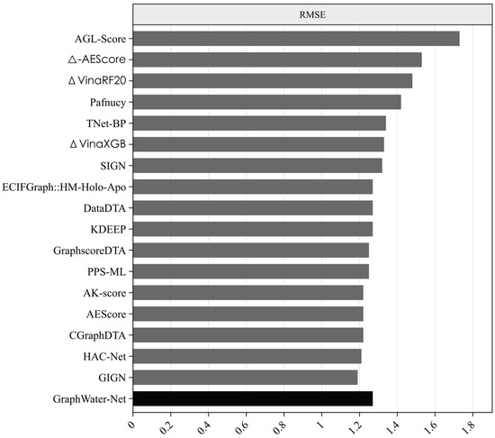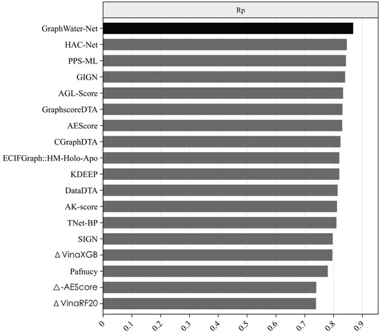 Many state-of-the-art methods have been proposed for predicting protein–ligand binding affinity. We selected 17 of these methods, as shown in Table 3, including AEScore [36], DataDTA [37], HAC-Net [38], GraphscoreDTA [39], CGraphDTA [40], PPS-ML [41], SIGN [42], TNet-BP [43], KDEEP [44], Pafnucy [45], and several others. Among them, methods such as ECIFGraph::HM-Holo-Apo, GraphscoreDTA, CGraphDTA, SIGN, and GIGN are GNN-based approaches. For example, GraphscoreDTA uses GNN modules to extract features of proteins, ligands, and pocket–ligand interactions, while CGraphDTA combines multiscale CNN and GNN architectures to represent drug and protein structures. All the methods have been trained on the PDBbind refined set (version 2016) and tested on the CASF-2016 test set. From Figure 2 and Figure 3, it can be seen that the proposed method, GraphWater-Net, which integrates a water network with a GNN, achieved the best performance, with the highest Rp value, outperforming these methods by margins ranging from 0.022 to 0.129. It also achieved the highest correlation between the predicted affinity value obtained from regression prediction and the experimental affinity value, ranking first. Although the RMSE value is not the lowest, it is only 0.08 higher than the method with the lowest RMSE, GIGN.
