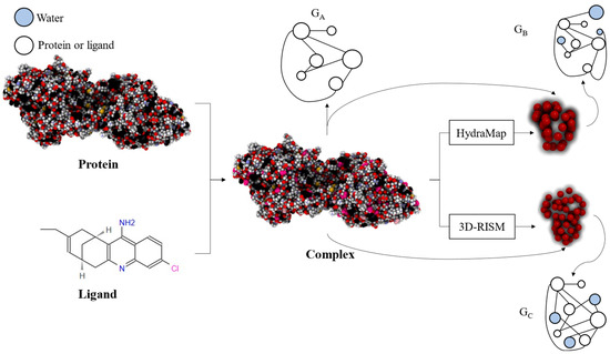 The overall workflow is illustrated in Figure 7. Firstly, the protein–ligand complex is represented to obtain GA. Then, HydraMap and 3D-RISM are used to predict the hydration sites in the binding pocket, resulting in two representations of the complex that incorporate water molecules, referred to as GB and GC.