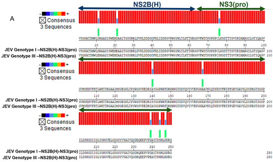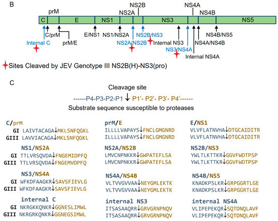Amino acid sequences of Japanese encephalitis virus genotypes including GI-SH7 strain (GenBank no MH753129.1) and GIII-SH15 strain (GenBank no MH753130.1) were assembled from the NCBI database (http://www.ncbi.nlm.nih.gov; accessed multiple times between 2019 to 2024). Sequences of recombinant NS2B(H)-NS3(pro) proteases and the predicted/anticipated cleavage sites at internal capsid (internal C), Cap/prM, prM/E, E/NS1, NS1/NS2A, NS2A/NS2B, NS2B/NS3, internal NS3, NS3/NS4A, internal NS4A), NS4A/NS4B, and NS4B/NS5 intersections were aligned using SnapGene (GSL Biotech LLC, San Diego, CA, USA) and MegAlign 7 (DNASTAR Inc., Madison, WI, USA) software.