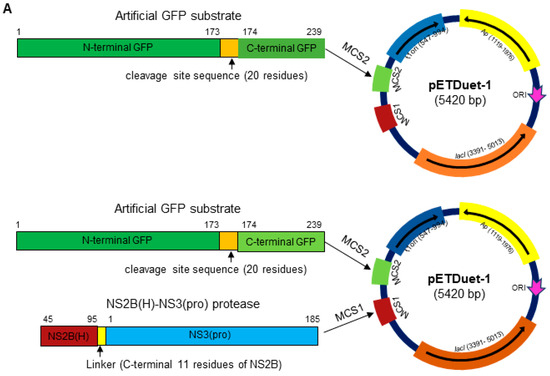 Sequences encoding JEV GI (SH 7) active and inactive NS2B(H)-NS3 pro proteases were generated as described previously and cloned into the MCS1 (multiple cloning site 1) of dual protein expression plasmid pETDuet-1 (Novagen, Beijing, China) through restriction sites EcoRI and NotI. For artificial GFP substrate, sequences encoding the anticipated cleavage sites, i.e., internal C, C/prM, prM/E, E/NS1, NS1/NS2A, NS2A/NS2B, NS2B/NS3, internal NS3, NS3/NS4A, internal NS4A, NS4A/NS4B, and NS4B/NS5 intersections, were cloned from JEV GI SH7 (Figure 1B,C) strain with particularly designed oligo dT primer pairs (Shanghai Sunny Biotec, Shanghai, China) by reverse transcriptase polymerase chain reaction (RT-PCR) and inserted between the N-terminal (amino acid 1 to 173) and C-Terminal (amino acid 174 to 239) of GFP by overlap extension PCR. The obtained sequence was cloned to MCS2 (multiple cloning site 2) of pETDuet-1 using [41]. The sequence of twenty alanine residues was inserted between the N-terminal and C-terminal part of GFP to generate a control artificial GFP substrate.