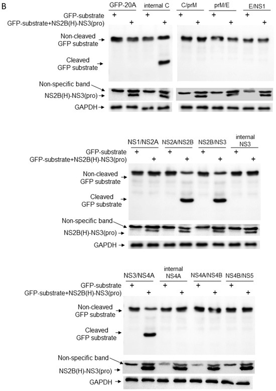 Studies have demonstrated that JEV protease activity mainly depends on the association between NS3 and its co-factor NS2B and that these two-component NS2B-NS3 proteases expressed in E. coli are folded correctly with effective proteolytic activity [28,40]. Therefore, in our previous study, we selected the prokaryotic cell model of E. coli to identify cleavage sites proteolytically processed by two-component JEV GIII-SH15 proteases [41]. GI-SH7, which exhibits different 3D protein conformations (Figure 7B) and eight critical substitutions (Figure 1C) in the protease region compared to GIII-SH15, was engineered to a dual protein prokaryotic expression plasmid pETDuet-1 (Figure 2A) to observe and compare the cleavage pattern of artificial GFP substrate containing a cleavage site from GI-SH7 (Figure 2). The artificial GFP substrate, when expressed alone in E. coli, did not show any cleavage by E. coli proteases. When recombinant viral NS2B(H)-NS3(pro) was co-expressed with all artificial substrates individually, a 21 kDa band corresponding to the N-terminal part of the cleaved substrate was seen (Figure 2B). The identified cleavage sites were validated by the co-expression of all artificial substrate sites with inactivated/dead viral NS2B(H)-NS3(pro), which was generated by the substitution of serine at position 135 located in the catalytic trait of NS3 with alanine (Figure 2C). Cleavage of artificial GFP substrates was determined by Western blot using antibodies specific to GFP and the expressions of viral proteases were determined by anti-NS3. Here, our results demonstrated that GI-SH7 was able to cleave the sites at the internal C, NS2A/NS2B, NS2B/NS3, and NS3/NS4A junctions and exhibited the same cleavage pattern as previously reported for SH-GIII [41], suggesting that viral protease substitution and protein conformation do not interfere with the selection of cleavage sites for proteolytic processing and possibly play no role in genotype displacement. The blots are added as (Supplementary Figure S1).