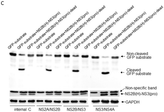 We found that GI-SH7 exhibits eight critical conserved substitutions in the NS2B(H)-NS3(pro) protease region compared to GIII-SH15. Data obtained after the alignment of fifty represented strains of GI and GIII revealed that two mutations in the NS2B hydrophilic domain have a conservation rate of 90–100%, whereas five mutations in NS3 proteases are conserved with a rate of 90–100% and one with a conservation rate of 50–89% [39]. Some previous observations have suggested that differences in the conformational space between NS2B-NS3 proteases of different flaviviruses might lead to differences in substrate recognition and affinity [42,43,44,45,46,47]. To analyze and compare the cleavage pattern of GI-SH7 with GIII-SH15 NS2B/NS3 proteases, the active and inactivated GI-SH7 and GIII-Sh15 [41] NS2B(H)-NS3(pro) proteases were structured and engineered into PET-Duet 1 vectors for expression in E. coli and the cleavage pattern was assessed by Western blot using respective antibodies. Our results demonstrated that GI-SH7 proteases were able to cleave the sites at the internal C, NS2A/NS2B, NS2B/NS3, and NS3/NS4A junctions and exhibited the same cleavage pattern as previously found for SH-GIII proteases [41], suggesting that viral protease substitution and differential protein conformation do not interfere with the selection of cleavage sites for proteolytic processing and possibly play no role in genotype displacement on this specific side. The identical cleavage patterns of both genotypes comprising critical mutations were supported by previous studies demonstrating that the substrate-recognizing sequence is highly conserved among all flaviviruses and contains two basic residues in P2 and P1 followed by a small unbranched amino acid in P1′ [48,49].