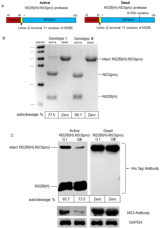 Cloning, expression, and purification of active and dead recombinant NS2B(H)-NS3(pro) proteases. (A) Schematic representation of recombinant plasmids. (B) SDS-PAGE for active and dead proteases NS2B(H)-NS3pro of GI and GIII. (C) Western blot was performed for active and dead NS2B(H)-NS3 of GI and GIII using His tag, JEV NS3, and GADBH antibodies. The bands were quantified by ImageJ software to determine the self-cleavage percentage.