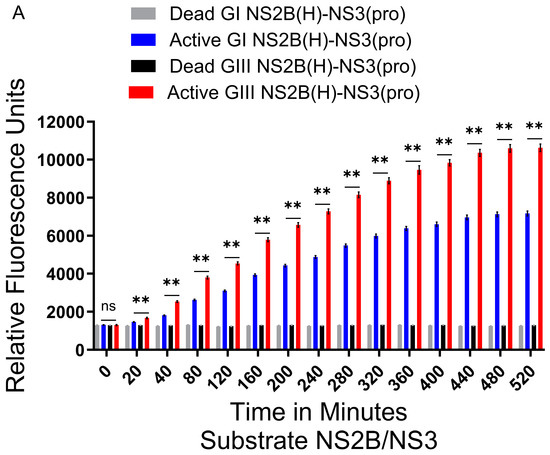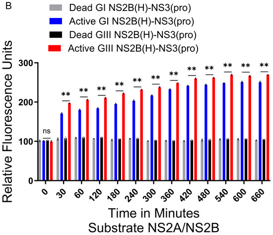 Active and dead JEV NS2B(H)-NS3(pro) catalyzed substrate hydrolysis rates. (A) The graph shows fluorescence/relative enzyme activities’ difference in active and dead JEV genotype I and III NS2B(H)-NS3(pro) proteases for hydrolysis/cleavage of Pyr-RTKR-AMC, a substrate site obtained from JEV cleavage site NS2B-NS3. A non-significant (p > 0.05) difference was seen at zero minutes (p = 0.9372). A statistically significant (p ≤ 0.01) difference with consistent p value (p = 0.0022) was seen from 20 min time point until 520 min when active GI-SH7 NS2B(H)-NS3(pro) was compared with active GIII-SH15 NS2B(H)-NS3(pro) proteases. (B) The graph represents fluorescence/relative enzyme activities’ difference in JEV genotype I and III active and dead NS2B(H)-NS3(pro) proteases for hydrolysis/cleavage of Dabcyl-PNKKRGWPAT-(Edans)G, a substrate cleavage site obtained from JEV NS2A-NS2B. A non-significant (p > 0.05) difference was seen at zero minutes (p = 0.8182). A statistically significant (p ≤ 0.01) difference with consistent p value (p = 0.0022) was seen from 30 min time point until 660 min when active GI-SH7 NS2B(H)-NS3(pro) was compared with active GIII-SH15 NS2B(H)-NS3(pro) proteases. Statistical differences are presented as follows: ns (non-significant), p > 0.05; and **, p ≤ 0.01.