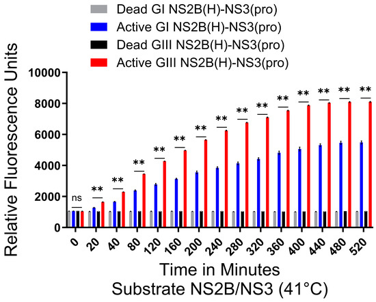 Active and dead JEV NS2B(H)-NS3(pro) catalyzed substrate hydrolysis rates at elevated temperatures. The graph represents fluorescence/relative enzyme activities’ difference in JEV genotype I and III active and dead NS2B(H)-NS3(pro) proteases for hydrolysis/cleavage of Pyr-RTKR-AMC, a substrate site obtained from JEV NS2B-NS3 at elevated temperatures, i.e., 41 °C. A non-significant (p > 0.05) difference was seen at zero minutes (p = 0.1797) between all groups. A statistically significant (p ≤ 0.01) difference with consistent p value (p = 0.0022) was seen from 20 min time point until 520 min when active GI-SH7 NS2B(H)-NS3(pro) was compared with active GIII-SH15 NS2B(H)-NS3(pro) proteases. Statistical differences are presented as follows: ns (non-significant), p > 0.05; and **, p ≤ 0.01.