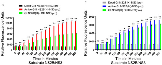 Role of NS2B hydrophilic domain in differential hydrolysis rates/proteolytic processing activities: (A) Schematic representation of reversed JEV GI-SH7, i.e., GIII NS2B(H)-GI NS3(pro) with exchanged hydrophilic domain from GIII-SH15 and reversed JEV GIII-SH15, i.e., GI NS2B(H)/GIII NS3(pro) with exchanged hydrophilic domains from GI-SH7. (B,C) The graphs represent and compare fluorescence/relative enzyme activities’ difference in JEV genotype GI-SH7 (B) and GIII-SH15 (C) with reversed JEV GI-SH7, i.e., GIII NS2B(H)-GI NS3(pro) for hydrolysis/cleavage of Pyr-RTKR-AMC, a substrate site obtained from JEV NS2B-NS3. (B) A non-significant (p > 0.05) difference was seen at zero minutes (p = 0.0931). A statistically significant (p ≤ 0.01) difference with a consistent p value (p = 0.0022) was seen from the 20 min time point until 520 min when compared with GI-SH7 NS2B(H)-NS3(pro). (C) Similarly, a non-significant (p > 0.05) difference was seen from zero minutes (p = 0.4848) time point until 520 min (p = 0.8182) with variable p values at different time points when compared with GIII-SH15 NS2B(H)-NS3(pro) proteases. (D,E) The graphs represent and compare fluorescence/relative enzyme activities’ difference in JEV genotype GIII-SH15 (D) and GI-SH7 (E) with reversed JEV GIII-SH15, i.e., GI NS2B(H)-GIII NS3(pro) for hydrolysis/cleavage of Pyr-RTKR-AMC, a substrate site obtained from JEV NS2B-NS3. (D) A non-significant (p > 0.05) difference was seen at zero minutes (p = 0.0932). A statistically significant (p ≤ 0.01) difference with consistent p value (p = 0.0022) was seen from the 20 min time point until 520 min when compared with GIII-SH15 NS2B(H)-NS3(pro) proteases. (E) Similarly, a non-significant (p > 0.05) difference was seen at zero minutes (p = 0.8182), 20 min (p = 0.6991), 40 min (p = 0.4848), 80 min (p = 0.2043), and 120 min (p = 0.0649). A statistically significant difference (p ≤ 0.05) was seen at 160 min (p = 0.0260) and 200 min (p = 0.0152), followed by a highly statistically significant (p ≤ 0.01) difference at 240 min (p = 0.0087). From 280 until 520 min, a highly significant (p ≤ 0.01) difference with consistent p value (p = 0.0043) was observed when compared with GI-SH7 NS2B(H)-NS3(pro) proteases. Statistical differences are presented as follows: ns (non-significant), p > 0.05; *, p ≤0.05; and **, p ≤ 0.01.