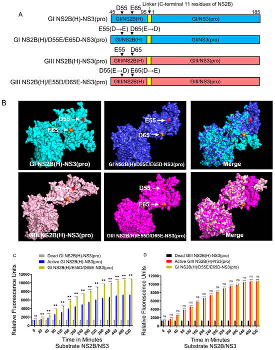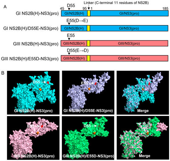 The hydrophilic domain of NS2B is responsible for differences in proteolytic processing activities between GI and GIII NS2B(H)-NS3(pro) proteases. This specific domain possesses two variations at positions 55 (NS2B-D55E) and 65 (NS2B-E65D) in the NS2B protein (Figure 1C). Data obtained after alignment of fifty represented strains of GI and GIII revealed that both mutations have a conservation rate of 90–100% [39]. To determine the contribution of NS2B-D55E to differential proteolytic processing activities between GI and GIII NS2B(H)-NS3(pro) proteases, we replaced aspartic acid (D) at position 55 of the GI NS2B(H)-NS3(pro) protease with glutamic acid (E) to generate a mutant protease of GI NS2B(H)/D55E-NS3(pro) and substituted aspartic acid (D) for glutamic acid (E) at position 55 of GIII NS2B(H)-NS3(pro) protease to generate a mutant protease of GIII NS2B(H)/E55D-NS3(pro) (Figure 7A). The substitution of NS2B-D55E variation resulted in a conformational change in NS2B(H), as compared with its respective parent (Figure 7B). The mutants of GI NS2B(H)/D55E-NS3(pro) and GIII NS2B(H)/E55D-NS3(pro) were prepared, and their proteolytic processing activities compared with their parental GI NS2B(H)-NS3(pro) and GIII NS2B(H)-NS3(pro) proteases. Exchanging the amino acid residue at 55 in GI NS2B(H) from aspartic acid to glutamic acid significantly increased the proteolytic processing activities of GI NS2B(H)/D55E-NS3(pro), as compared to its parental GI NS2B(H)-NS3(pro) protease (Figure 7C). However, the levels of GI NS2B(H)/D55E-NS3(pro) protease activities remained significantly lower than those of GIII NS2B(H)-NS3(pro) protease from 40 min and onwards (Figure 7D). These results indicate that the substitution of NS2B-D55E contributed to the increased proteolytic processing of GI NS2B(H)/D55E-NS3(pro) over its parental GI NS2B(H)-NS3(pro). When the amino acid at position 55 in GIII NS2B(H) was exchanged from glutamic acid to aspartic acid, the levels of GIII NS2B(H)/E55D-NS3(pro) protease activities significantly decreased, as compared to its parental GIII NS2B(H)-NS3(pro) protease (Figure 7E) but remained higher than those of GI NS2B(H)-NS3(pro) protease (Figure 7F). Collectively, these results demonstrated that the NS2B-D55E variation in the hydrophilic domain of NS2B contributed to the difference in NS2B(H)-NS3(pro) protease activities between GI and GIII.