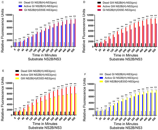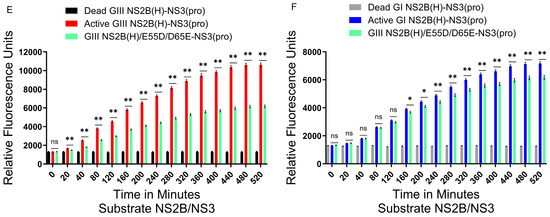 Co-contribution of NS2B-D55E and NS2B-E65D variations in the hydrophilic domain of NS2B to proteolytic activities of NS2B(H)-NS3(pro). (A) Schematic diagram of reversed JEV GI-SH7, i.e., GI NS2B(H)/D55E/E65D-NS3(pro) and reversed JEV GIII-SH15, i.e., GIII NS2B(H)/E55D/D65E-NS3(pro) with exchanged NS2B-D55E and NS2B-E65D variations from their respective parent NS2B(H)-NS3(pro) proteases. (B) The graph represents and compares 3D structural conformations of reversed JEV GI-SH7, i.e., GI NS2B(H)/D55E/E65D-NS3(pro) and reversed JEV GIII-SH15, i.e., GIII NS2B(H)/E55D/D65E-NS3(pro) with their respective parent GI-SH7 and GIII-SH15 NS2B(H)-NS3(pro) proteases. Variations NS2B(H)55 and NS2B(H) 65 are highlighted in red and yellow, respectively. (C,D) The graphs represent and compare fluorescence/relative enzyme activities’ difference in JEV genotype GI-SH7 (C) and GIII-SH15 NS2B(H)-NS3(pro) proteases (D) with reversed JEV GI-SH7, i.e., GI NS2B(H)/D55E/E65D-NS3(pro) for hydrolysis/cleavage of Pyr-RTKR-AMC, a substrate site obtained from JEV NS2B-NS3. (C) A non-significant (p > 0.05) difference was seen at zero minutes. A statistically significant (p ≤ 0.01) difference with a consistent p value was seen from the 20 min time point until 520 min when compared with GI-SH7 NS2B(H)-NS3(pro) proteases. (D) Similarly, a non-significant (p > 0.05) difference was seen from zero minutes time point until 520 min (p = 0.8182) with variable p values at different time points when compared with GIII-SH15 NS2B(H)-NS3(pro) proteases. (E,F) The graphs represent and compare fluorescence/relative enzyme activities’ difference in JEV genotype GI-SH7 (F) and GIII-SH15 (E) NS2B(H)-NS3(pro) proteases with reversed JEV GIII-SH15, i.e., GIII NS2B(H)/E55D/D65E-NS3(pro) for hydrolysis/cleavage of Pyr-RTKR-AMC, a substrate site obtained from JEV NS2B-NS3. (E) A non-significant (p > 0.05) difference was seen at zero minutes. A statistically significant (p ≤ 0.01) difference with consistent p value (p = 0.0022) was seen from the 20 min time point until 520 min when compared with GIII-SH15 NS2B(H)-NS3(pro) proteases. (F) Similarly, a non-significant (p > 0.05) difference was seen at zero minutes, 20 min, 40 min, 80 min, and 120 min. A statistically significant difference (p ≤ 0.05) was seen at 160 min (p = 0.0260) and 200 min (p = 0.0152), followed by a highly significant (p ≤ 0.01) difference at 240 min (p = 0.0087). From 280 until 520 min, a highly significant (p ≤ 0.01) difference with consistent p value (p = 0.0043) was observed when compared with GI-SH7 NS2B(H)-NS3(pro)proteases. Statistical differences are presented as follows: ns (non-significant), p > 0.05; *, and p ≤ 0.05; **.