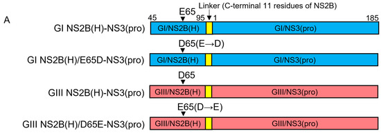 To determine the contribution of NS2B-E65D variation in the hydrophilic domain of NS2B to the difference in NS2B(H)-NS3(pro) protease activities between GI and GIII, we replaced glutamic acid (E) at position 65 of GI NS2B(H)-NS3(pro) protease with aspartic acid (D) to generate a mutant protease of GI NS2B(H)/E65D-NS3(pro) and substituted glutamic acid (E) for aspartic acid (D) at position 65 of GIII NS2B(H)-NS3(pro) protease to generate a mutant protease of GIII NS2B(H)/D65E-NS3(pro) (Figure 8A). The substitution of NS2B-E65D variation resulted in a conformational change in NS2B(H), as compared with its respective parent (Figure 8B). The mutants of GI NS2B(H)/E65D-NS3(pro) and GIII NS2B(H)/D65E-NS3(pro) were prepared, and their proteolytic processing activities were compared with their parental GI NS2B(H)-NS3(pro) and GIII NS2B(H)-NS3(pro) proteases. Exchanging the amino acid residue at position 65 in GI NS2B(H) from glutamic acid to aspartic acid significantly increased the proteolytic processing activities of GI NS2B(H)/E65D-NS3(pro), as compared to its parental GI NS2B(H)-NS3(pro) protease (Figure 8C). However, the levels of GI NS2B(H)/E65D-NS3(pro) protease activities remained lower than those of GIII NS2B(H)-NS3(pro) protease (Figure 8D). These results indicated that the co-substitution of NS2B-E65D contributed to the increased proteolytic processing of GI NS2B(H)/E65D-NS3(pro) over its parental GI NS2B(H)-NS3(pro). When the amino acid residue at position 65 in GIII NS2B(H) was exchanged from aspartic acid to glutamic acid, the levels of GIII NS2B(H)/D65E-NS3(pro) protease activities significantly decreased, as compared to its parental GIII NS2B(H)-NS3(pro) protease (Figure 8E) but remained higher than those of GI NS2B(H)-NS3(pro) protease (Figure 8F). Collectively, these results demonstrated that the NS2B-E65D variation in the hydrophilic domain of NS2B contributed to the difference in NS2B(H)-NS3(pro) protease activities between GI and GIII.