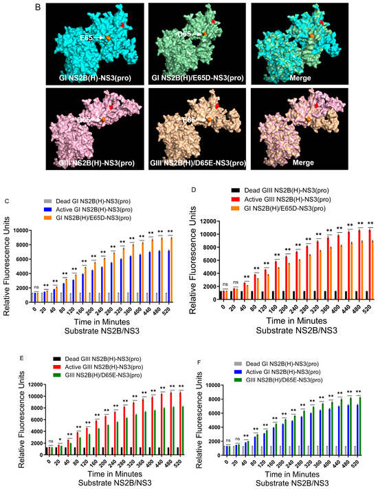 Contribution of variation 65 in the hydrophilic domain of NS2B to proteolytic activities of NS2B(H)-NS3(pro). (A) Schematic diagram of reversed JEV GI-SH7, i.e., GI NS2B(H)/ E65D-NS3(pro) and reversed JEV GIII-SH15, i.e., GIII NS2B(H)/D65E-NS3(pro) with exchanged NS2B-65 variations from their respective parent NS2B(H)-NS3(pro) proteases. (B) The graph represents and compares 3D structural conformations of reversed JEV GI-SH7, i.e., GI NS2B(H)/E65D-NS3(pro) and reversed JEV GIII-SH15, i.e., GIII NS2B(H)/D65E-NS3(pro) with their respective parent GI-SH7 and GIII-SH15 NS2B(H)-NS3(pro) proteases. Variation NS2B(H)65 is highlighted in yellow. (C,D) The graphs represent and compare fluorescence/relative enzyme activities’ difference in JEV genotype GI-SH7 (C) and GIII-SH15 NS2B(H)-NS3(pro) proteases (D) with reversed JEV GI-SH7, i.e., GI NS2B(H)/E65D-NS3(pro) for hydrolysis/cleavage of Pyr-RTKR-AMC, a substrate site obtained from JEV NS2B-NS3. (C) A non-significant (p > 0.05) difference was seen at zero minutes (p = 0.4848). A significant (p ≤ 0.01) difference with a consistent p value (p = 0.0022) was seen from the 20 min time point until 520 min when compared with GI-SH7 NS2B(H)-NS3(pro) proteases. (D) Similarly, a non-significant (p > 0.05) difference was seen for zero (p = 0.6991) and 20 min (p = 0.1797). A significant (p ≤ 0.01) difference with a consistent p value (p = 0.0022) was seen from the 20 min time point until 520 min when compared with GIII-SH15 NS2B(H)-NS3(pro) proteases. (E,F) The graphs represent and compare fluorescence/relative enzyme activities’ difference in JEV genotype GI-SH7 (F) and GIII-SH15 (E) NS2B(H)-NS3(pro) proteases with reversed JEV GIII-SH15, i.e., GIII NS2B(H)/D65E-NS3(pro) for hydrolysis/cleavage of Pyr-RTKR-AMC, a substrate site obtained from JEV NS2B-NS3. (E) A non-significant (p > 0.05) difference was seen at zero minutes (p = 0.5887). A statistically significant (p ≤ 0.05) difference was seen at the 20 min time point (p = 0.0152), followed by a highly significant (p ≤ 0.01) difference with consistent p value (p = 0.0022) seen from 40 until 520 min when compared with GIII-SH15 NS2B(H)-NS3(pro) proteases. (F) Similarly, a non-significant (p > 0.05) difference was seen for zero (p = 0.2403) and 20 min (p = 0.0649) time points. A statistically significant (p ≤ 0.01) difference with consistent p value (p = 0.0022) was seen from the 40 min time point until 520 min when compared with GI-SH7 NS2B(H)-NS3(pro) proteases. Statistical differences are presented as follows: ns (non-significant), p > 0.05; *, p ≤ 0.05; and **, p ≤ 0.01.