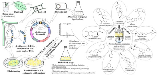 The biosynthesis of the SMs is controlled by structural genes that encode enzymes of metabolic reactions and the genes with regulatory functions that encode the TFs regulating the structural genes upon binding their promoters []. Several examples of metabolic engineering of SMs in HRs are summarized in Table 2.