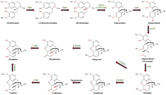 The metabolic pathway of morphinan alkaloids biosynthesis, showing two routes from thebaine to morphine. DRS—1.2-dehydroreticuline synthase (EC 1.14.19.54); DRR—1.2-dehydroreticuline reductase (EC 1.5.1.27); SalSyn/CYP719B1—CYP salutaridine synthase (EC 1.14.19.67); SalR—salutaridine: NADPH 7-oxidoreductase (EC 1.1.1.253); SalAT/SAT—acetylcoenzyme A: salutaridinol-7-O-acetyltransferase (EC. 2.3.1.150); THS—thebaine synthase (EC 4.2.99.24); T6ODM—thebaine 6-O-demethylase (EC 1.14.11.31); COR—codeinone reductase (EC 1.1.1.247); CODM—codeine O-demethylase (EC 1.14.11.32).