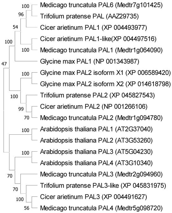 Phylogenetic analysis annotated PALs in Medicago truncatula, Arabidopsis thaliana, and other species of plants belonging to the Fabaceae family, created on the basis of amino acid sequences using the Neighbor-Joining method.