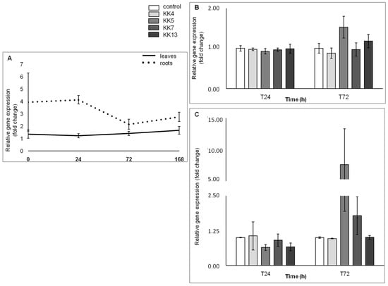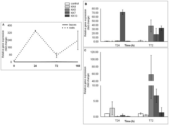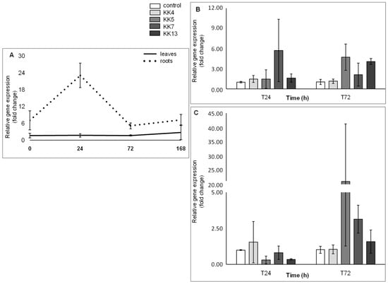 MtPAL4 gene expression profile in leaves and roots of non-inoculated M. truncatula seedlings (at time points: T0—seedlings aged 35 days; T24—36 days; T72—38 days; T168—42 days) (A) and the effect of rhizobacteria on the expression of this gene in leaves (B) and roots (C) 24 and 72 h after inoculation of 35-day-old seedlings.