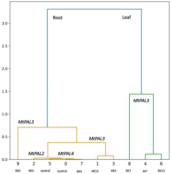 The results obtained with the qPCR method confirmed those previously obtained with the semi-quantitative PCR method and indicated that the expression level of MtPAL2, MtPAL4, and MtPAL3 genes in the roots of non-inoculated plants is higher than in the leaves (Figure 2A, Figure 3A and Figure 4A), which was also confirmed by hierarchical cluster analysis (Figure 5). The level of MtPAL2 gene expression in the roots at T0 and T24 was about 4 times higher, and after 168 h, about 1.7 times higher than in leaves (Figure 2A). Inoculation of seedlings with the bacterial suspension had no effect on the level of MtPAL2 expression in leaves after 24 h (Figure 2B), while after 72 h, a 1.5-fold increase in the level of gene expression was observed under the influence of Pseudomonas brassicacearum KK5 (Figure 2B). In the roots, 24 h after inoculation of the seedlings with a suspension of two strains of P. brassicacearum KK5 and Sinorhizobium meliloti KK13, a significant decrease in MtPAL2 gene expression was observed or, as in the case of inoculation with other strains, no effect. However, 72 h after inoculation of P. brassicacearum KK5 and P. corrugata KK7, the amount of MtPAL2 gene transcript in the roots increased almost 8-fold and 1.8-fold, respectively (Figure 2C). Another PAL3 gene showed strong root specificity because its expression level in the root at times T0, T24, T72, and T168 was higher than that in the leaf by 12, 340, 74, and 238 times, respectively, while in the leaves, it showed a constant low level (Figure 3A). On the other hand, inoculation of seedlings with a suspension of Pseudomonas bacteria i.e., P. corrugata KK7 and P. brassicacearum KK5, and the symbiotic strain Sinorhizobium meliloti KK13 resulted in a significant increase in the expression of the MtPAL3 gene in the leaves. The P. corrugata KK7 strain caused a very large increase in the expression of this gene after 24 h and 72 h, by 71- and 17-fold, respectively, and the inoculation of P. brassicacearum KK5 and Sinorhizobium meliloti KK13 resulted in an increase in expression, respectively, by 38- and 32-fold after 72 h (Figure 3B). In the roots, a decrease in MtPAL3 gene expression was observed 24 h after inoculation of P. brassicacearum KK5, P. corrugata KK7, and S. meliloti KK13, followed by an increase 72 h after inoculation of P. brassicacearum KK5 (58 times) and P. corrugata KK7 (6.7 times)—Figure 3C.