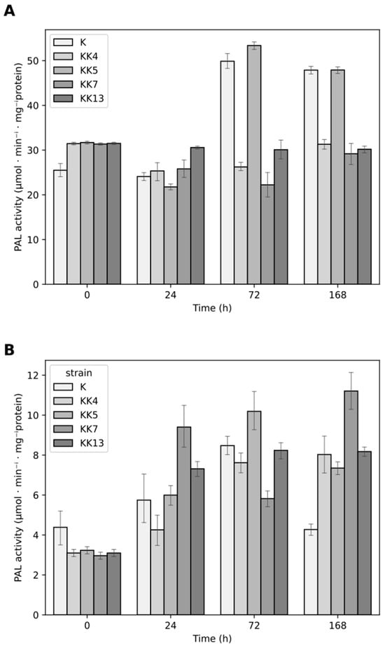 Changes in the activity of this enzyme in leaves and roots after treatment with rhizobacteria were visible (Figure 6). Slight changes were observed in the leaves 24 h after inoculation, with three strains inducing PAL activity: most effectively Sinorhizobium meliloti KK13—27%; then Pseudomonas corrugata KK7—7.1%; and Paenibacillus borealis KK4—5.2%. Three days after inoculation, only one strain, P. brassicacearum KK5, slightly increased PAL activity by 7%, while the others decreased it by 39 to 55%, and after another 4 days, most of the strains significantly decreased enzyme activity (from 35 to 39%). It should be noted, however, that taking into account the dynamics of changes, the activity of the PAL enzyme in the leaves of plants treated with three strains (KK4, KK7, and KK13) remained at a similar level, while inoculation with P. brassicacearum KK5 increased the activity between days 1 and 3 by 145% and reached a level close to the control (Figure 6A and Figure 7).