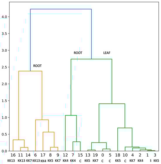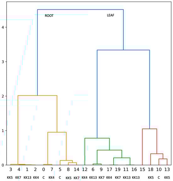 In roots, PAL activity increased 24 h after inoculation with P. corrugata KK7 and S. meliloti KK13, by 9.4 and 7.3%, respectively. After 72 h, the P. brassicacearum KK5 strain induced resistance by 28.4%, while P. corrugata KK7 inhibited PAL activity by 31.3%. Inoculation with all strains increased PAL enzyme activity in roots 168 h after inoculation. In particular, P. corrugata KK7 increased activity by 162%, followed by S. meliloti KK13 by 93%, P. borealis KK4 by 88%, and P. brassicacearum KK5 by 72% (Figure 6B). The effect of these strains on PAL activity in the roots was also confirmed by hierarchical cluster analysis (Figure 7).
