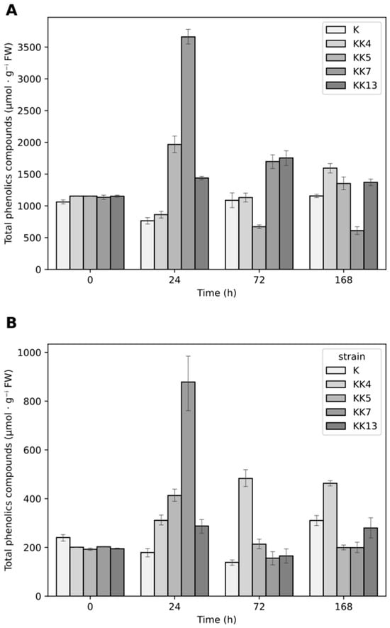 After inoculation with bacteria, changes in the total content of phenolic compounds were observed in the leaves and roots of the seedlings compared to the control (Figure 8). In the leaves 24 h after the inoculation of Pseudomonas corrugata KK7, P. brassicacearum KK5, and Sinorhizobium meliloti KK13, an increase in the content of phenolic compounds by 378, 157, and 88% was observed, respectively. After 72 h, an increase in the content of phenols was visible after treatment with the suspension of P. corrugata KK7 by 93% and S. meliloti KK13 by 99%. The increase in the content of these compounds in the leaves by 38% was also caused by the inoculation of Paenibacillus borealis KK4 after 168 h, while the inoculation of Pseudomonas corrugata KK7 reduced the content of phenolic compounds in the leaves (Figure 8A). Inoculation of seedlings with a suspension of P. brassicacearum KK5 and P. corrugata KK7 resulted in an increase in the content of phenols after 24 h by 130 and 390%, respectively, and Paenibacillus borealis KK4 increased after 72 and 168 h by 267 and 49%, respectively (Figure 8B).