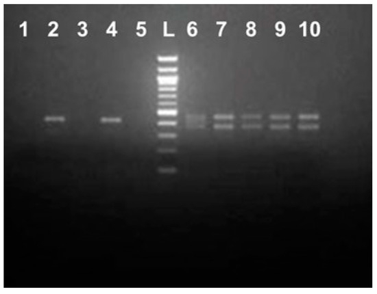 Specific PCR amplification using primers based on the VAC-1M sequence and DNA from the adult Russian sturgeon (Acipenser gueldenstaedtii). Lanes 1–5: adult females (F1 through F5) DNA; 6–10: adult males (M1 through M5) DNA; L: 2-log DNA ladder (NEB).