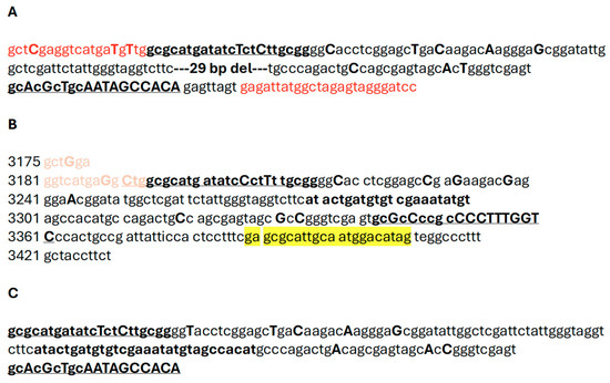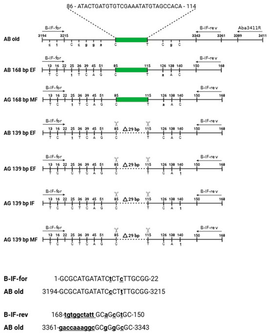 Overall, we have detected a 139 bp version of this genomic region for all A. gueldenstaedtii samples grown at three different fish farms (IF, MF, and EF) as well as for A. baerii originated at the EF. They all have almost identical sequences except a single nucleotide substitution specific to A. baerii (Figure 7, nt position 140), and all have the same 29 bp deletion if compared to the original 168 bp long sequence of this region. The 168 bp version was detected for Siberian sturgeon from the EF and only Russian sturgeon fish grown at the MF. The sequences for both species are identical if compared to each other, and they all have the same mutations at nt positions 25 and 126 in comparison to the 139 bp variation (Figure 7). However, both 168 bp and 139 bp long sequences are very different from the original A. baerii sequence for this region reported 25 years ago. They have five more identical nt substitutions located outside of the primers used for amplification (nts 36, 39, 45, 51, and 138 as shown in Figure 7). There are two more mutations that were introduced by forward amplification primer (nts 13 and 16) and 13 mutations introduced by the reverse primer (shown in bold as small, underlined letters in primer sequence). Importantly, both oligos were originally designed based on the cloned and specific sequence of the B fragment (see Figure 3 and Figure 4). Multiple DNA samples from skin swabs originated from fish of different ages grown at the MF were tested using B-IF-for/B-IF-rev primers to further validate the 168 bp/139 bp types of variations. The results were very similar to the MF caviar-derived DNA testing. Most of the samples generated 168 bp PCR products while some, as shown in Figure S4, contained both versions, indicating that the process of mutation selection is independent from the fish ages, most likely not random, and is ongoing.